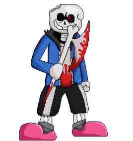 Horror sans (also known as Horror!sans) is a variation of the character sans the skeleton and originated from a horror comic called "Horrortale comic" and shows you what happens after the neutral ending. Sans appears in chapter 2 of the comic and quickly became the fan favourite. The Fraymakers variants tries to capture the horror tone while toning it down too fit into the Fraymakers base cast and too not scare kids. He is also the heavist but hard hitting out of the Murder Time Trio